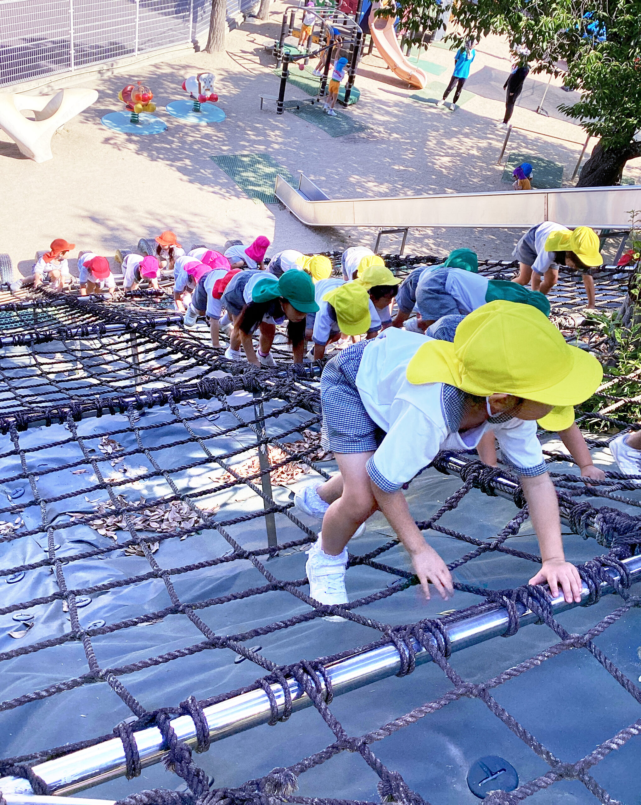 総合遊具で手足の力を使って遊んだり、水遊び・ボール遊び・鬼ごっこなどを通して、楽しみながら自然に身体を動かす機会を大切にしています。ルールのある遊びや友だちとの競争の中で、思いやりや社会性も育まれていきます。